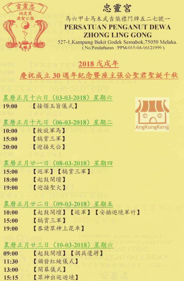 马六甲忠灵宫庆祝成立卅週年纪念暨座主张公圣君圣诞千秋出巡游境庆典